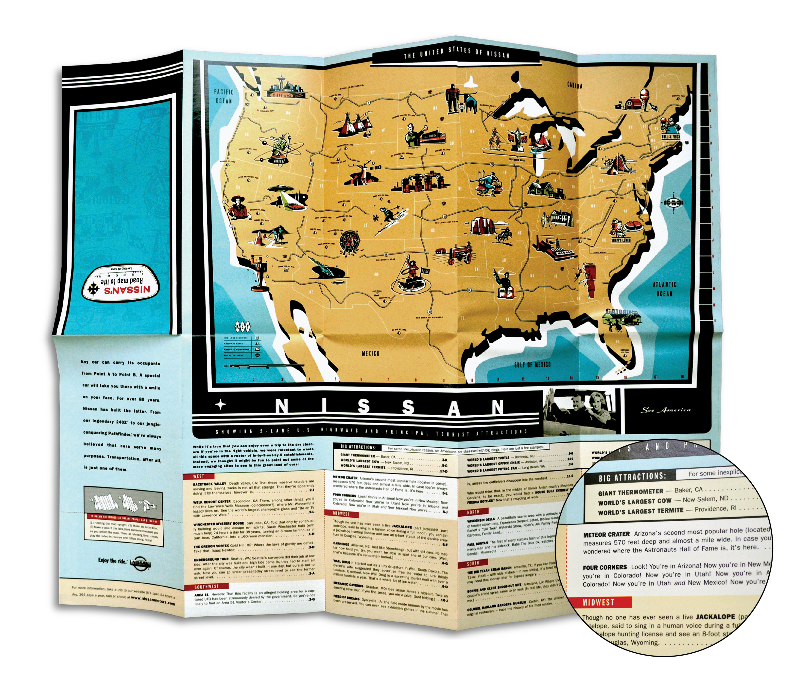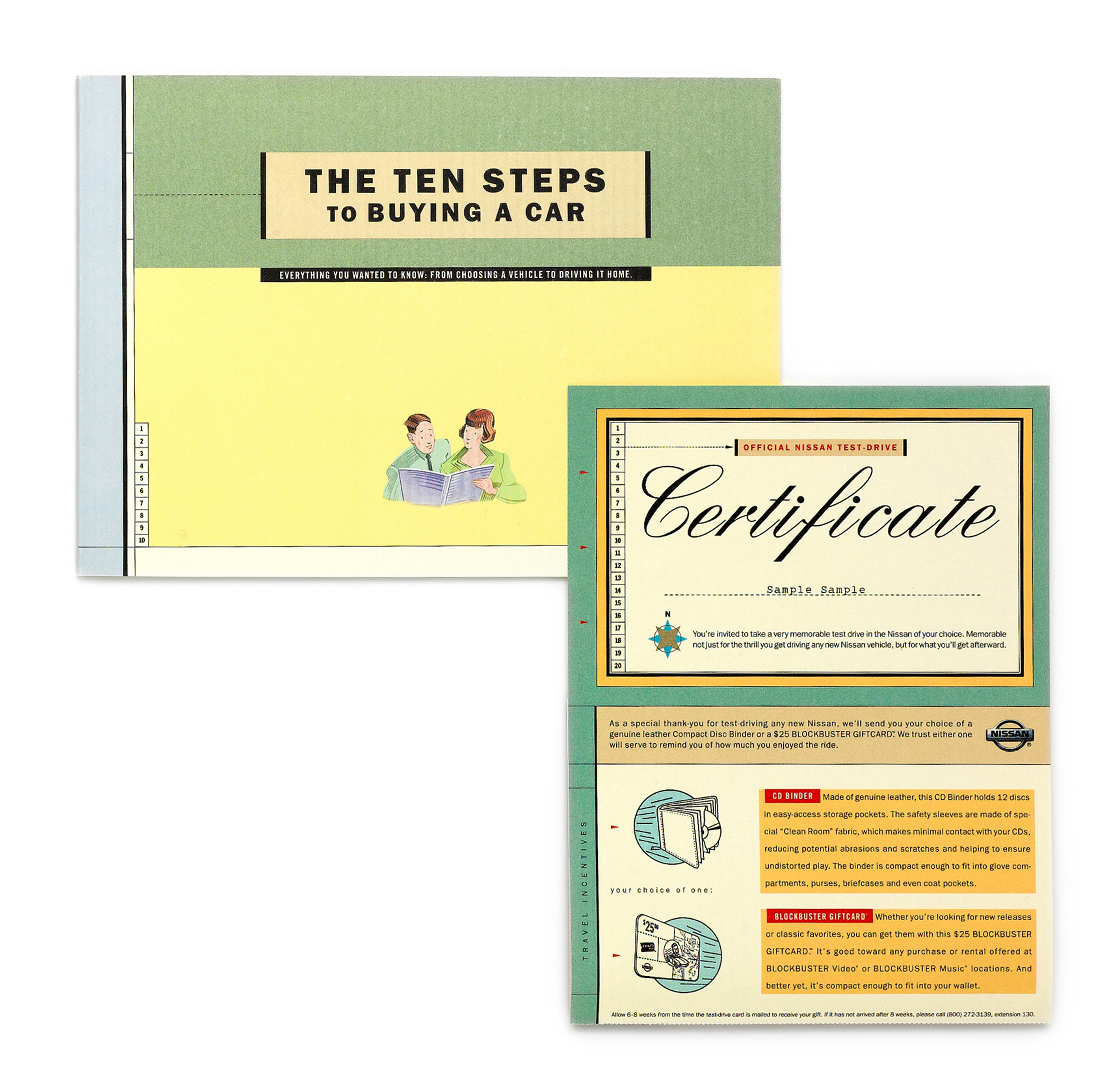 Vision: A premium slip-case box with an enclosed dimensional folder. Inside is a tipped-in booklet (to the left) and video (to the right) that is displayed inside the printed CX-9 navigation monitor.